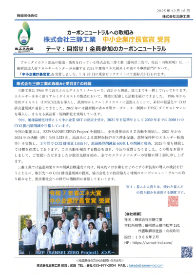 株式会社 三静工業は、2025年12月15日、一般財団法人省エネセンター様より、以下の内容で、優れた省エネ活動の取組みを表彰する「省エネ大賞」において、弊社プロジェクト(SZP)の省エネ活動への取組みが「中小企業庁長官賞」を受賞いたしました。